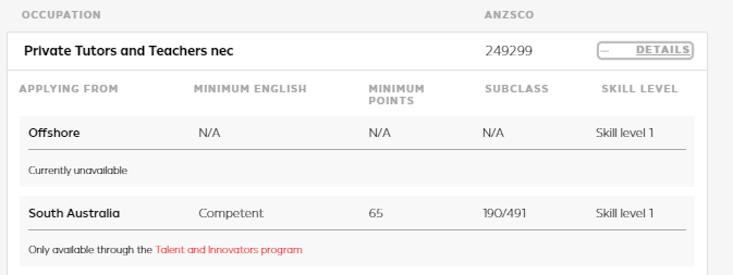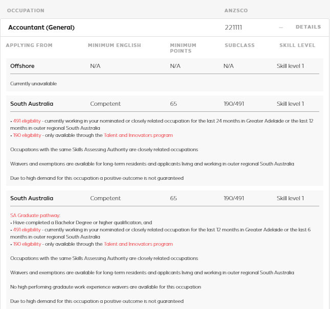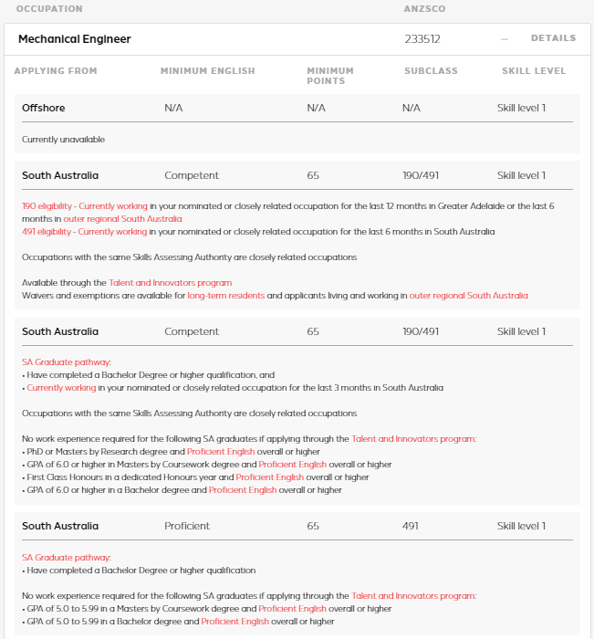 與其他州的官方網站不同的是,南澳州政府的移民網站系統是一個檢索系統。申請人輸入自己職業的ANZSCO代碼,就會出現該職業對應的具體要求。