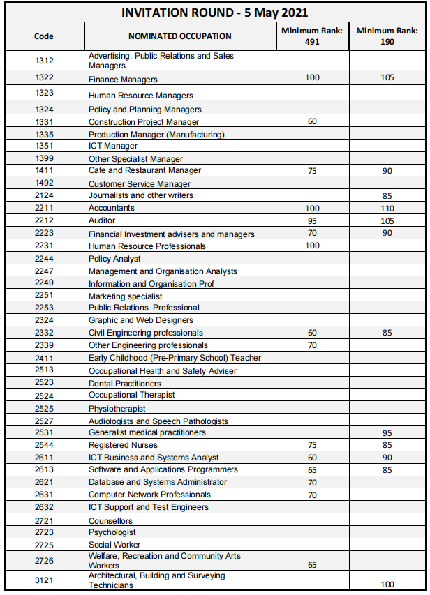 從2021年5月3日起,ACT堪培拉將開(kāi)始使用最新的關(guān)鍵職業(yè)清單,移除了6個(gè)職業(yè)之后,清單中還增加了一些新職業(yè)。在新增職業(yè)中,本輪1322財(cái)務(wù)經(jīng)理491最低邀請(qǐng)分?jǐn)?shù)為100分,190最低為105分;1331建筑項(xiàng)目經(jīng)理僅發(fā)放491邀請(qǐng),最低60分獲邀;2212審計(jì)491最低95分獲邀,190最低為105分;除此之外,新增職業(yè)還有1411咖啡店和餐廳經(jīng)理、2223金融投資顧問(wèn)和經(jīng)理、2231人力資源專家、2339其他工程專家、3121建筑和測(cè)量技術(shù)人員、3514廚師本輪發(fā)放了邀請(qǐng)。