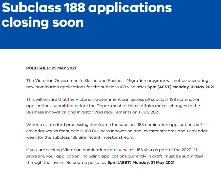這將使維州政府在內政部(DHA)于2021年7月1日對商業創新和投資者簽證要求進行更改之前,有時間評估提交的