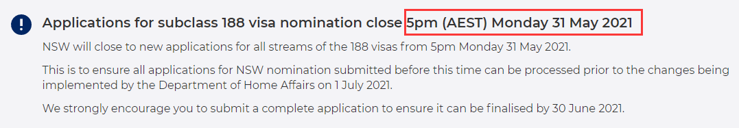 新州政府強烈建議想申請188簽證的申請人盡快提交完整的申請,以確保可以在2021年6月30日之前完成申請。