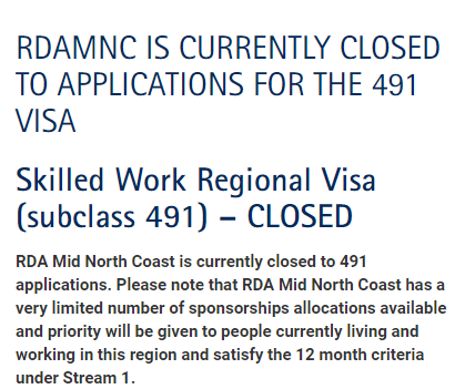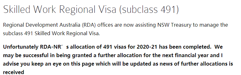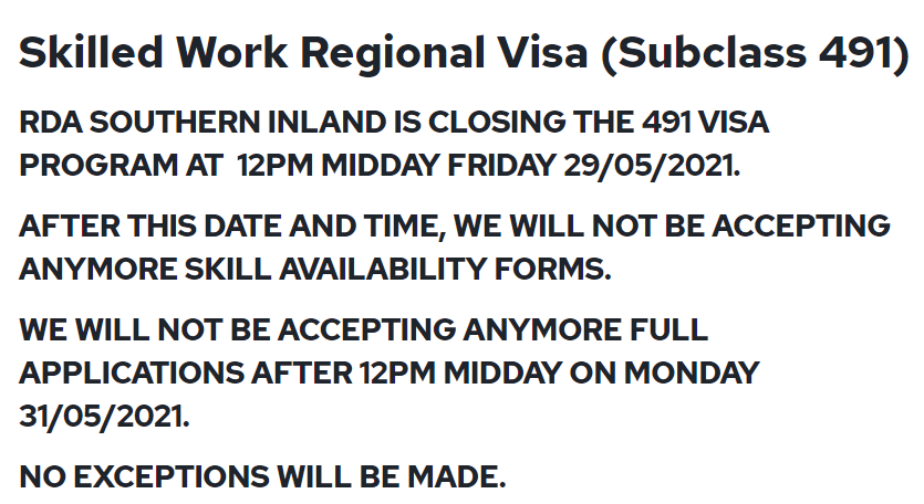 RDA Southern Inland 表示491類別 5月29日12pm關閉,5月31日12pm后將不會接受任何申請。