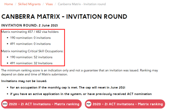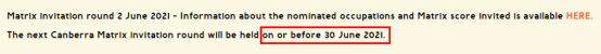 要注意的是,堪培拉Matrix的邀請原則是優先邀請Matrix分數較高的申請人,而且每個職業大類每月的邀請名額有限制,如果當月的邀請名額已發完,當月將不再發出邀請。所以,只有在本組職業類別中分數越高,排名越靠前,才更有機會獲邀。