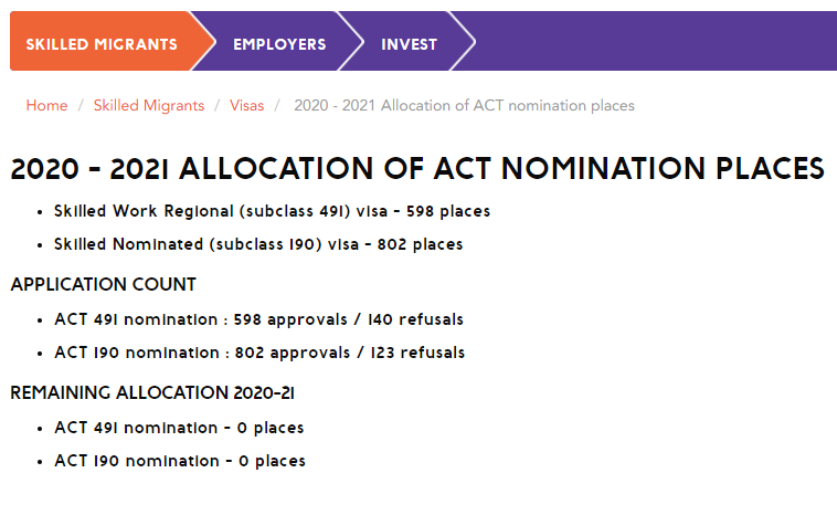 之前,ACT堪培拉已公布2020-21財年190和491簽證提名配額已經使用完畢。新的處理將在2021年7月重新開始。