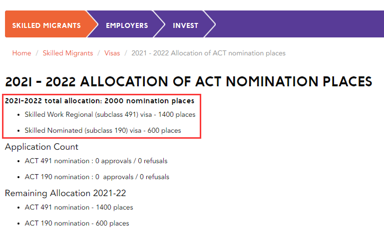 在昨日(6月22日),ACT官網公布了2021-22 財年190和491簽證的配額,總數增加了600個到2000個。