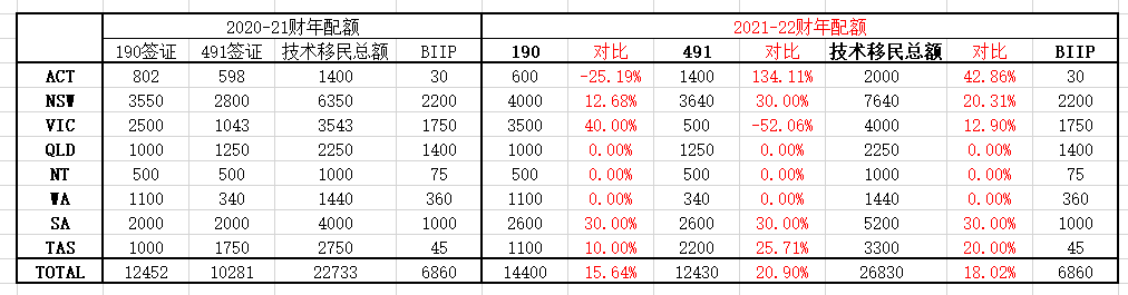 ACT、NSW、VIC、SA、TAS技術移民配額總數都提高了,其中ACT增幅最大,但NSW的增加數量最多;