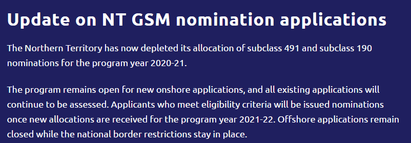 NT北領地上財年未關閉申請,符合資格條件的申請人將在收到2021-22財年的新配額獲得提名。