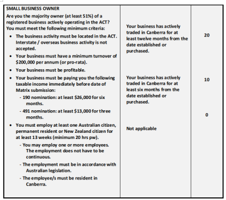 在之前的打分表中,在堪培拉購買或建立業務,過去兩年內任意一年年營業額20萬澳幣或者投資ACT初創公司20萬澳幣的,可以加上5分;