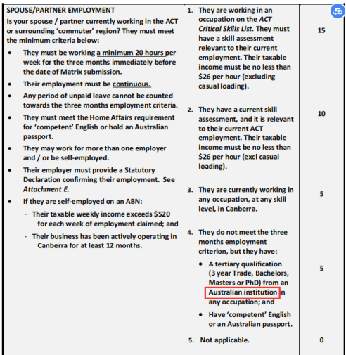 之前的打分表中顯示,如果配偶沒有工作,但是有任意專業的tertiary qualification(至少三年連續的全日制學習)和competent英語水平就可以加5分。