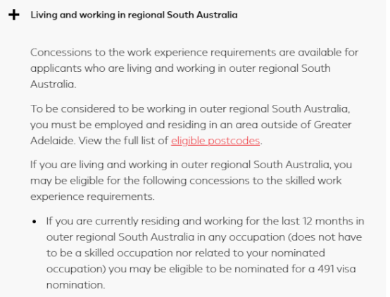 b、在南澳偏遠地區工作和居住通道要求(指的是在Greater Adelaide以外的地區):