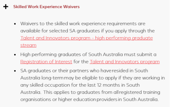 2、如果過去12個月在南澳從事任何技術職業,則長期居住在南澳的南澳畢業生或其配偶可能有資格申請工作經驗豁免(這適用于南澳所有注冊培訓機構或高等教育機構的畢業生)。?
