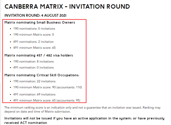 要注意的是,堪培拉Matrix的邀請原則是優先邀請Matrix分數較高的申請人,而且每個職業大類每月的邀請名額有限制,如果當月的邀請名額已發完,當月將不再發出邀請。所以,只有在本組職業類別中分數越高,排名越靠前,才更有機會獲邀。