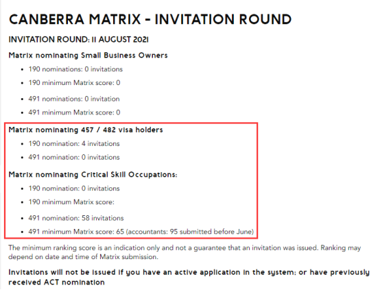 要注意的是,堪培拉Matrix的邀請原則是優先邀請Matrix分數較高的申請人,而且每個職業大類每月的邀請名額有限制,如果當月的邀請名額已發完,當月將不再發出邀請。所以,只有在本組職業類別中分數越高,排名越靠前,才更有機會獲邀。