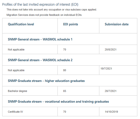 畢業生類別-本科以上學歷:EOI最低65分,2021年7月28日遞交
