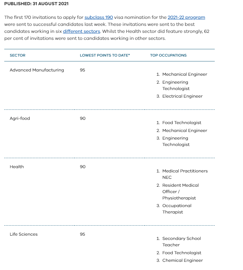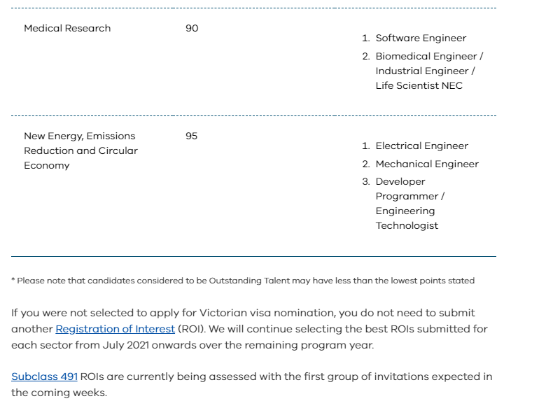 注:如果申請人被維州政府認為是杰出人才,獲邀分數將比上述分數更低。