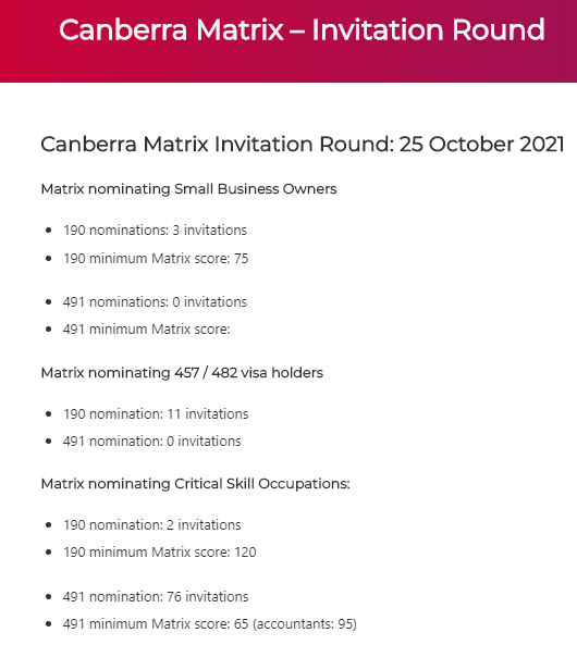 要注意的是,457/482簽證持有者類別僅需65分即可獲得邀請(qǐng)去申請(qǐng)?zhí)崦∩庵骱完P(guān)鍵職業(yè)類別是根據(jù)Matrix打分排名,擇優(yōu)錄取。分?jǐn)?shù)越高,將有機(jī)會(huì)更早獲邀。