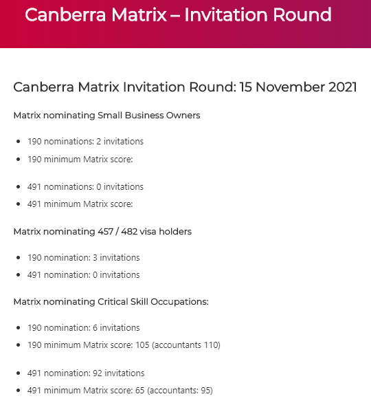 要注意的是,457/482簽證持有者類別僅需65分即可獲得邀請去申請提名,而小生意主和關鍵職業類別是根據Matrix打分排名,擇優錄取。分數越高,將有機會更早獲邀。