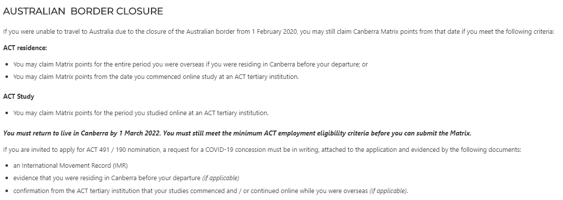 ACT政府宣布:從2020年2月1日起因國境關閉無法回澳的,如果滿足要求可以在Matrix中加上對應的居住和學習分數。