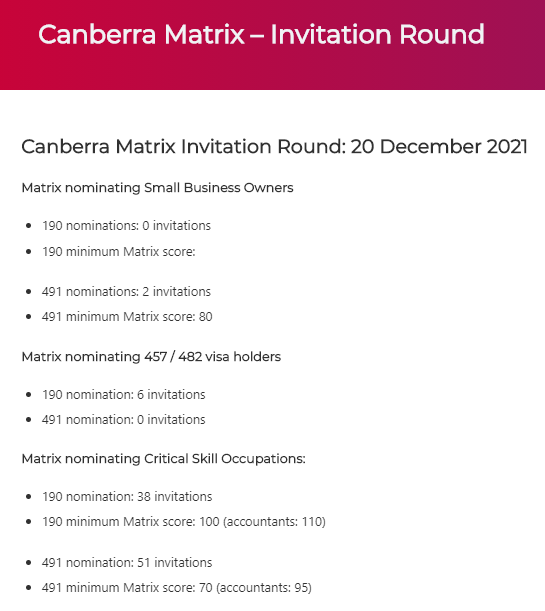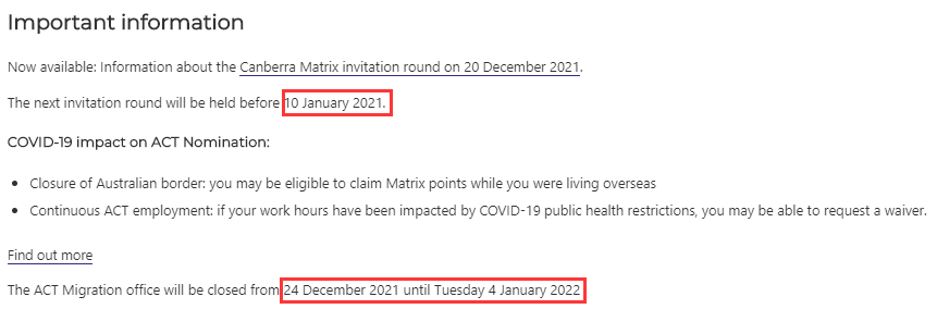 ACT州政府仍然保持了每周一邀的頻率,但是由于圣誕節(jié)將至,州政府移民辦公室即將放假,下次邀請(qǐng)預(yù)計(jì)在2021年1月10日之前。