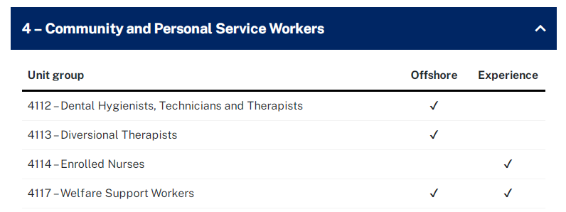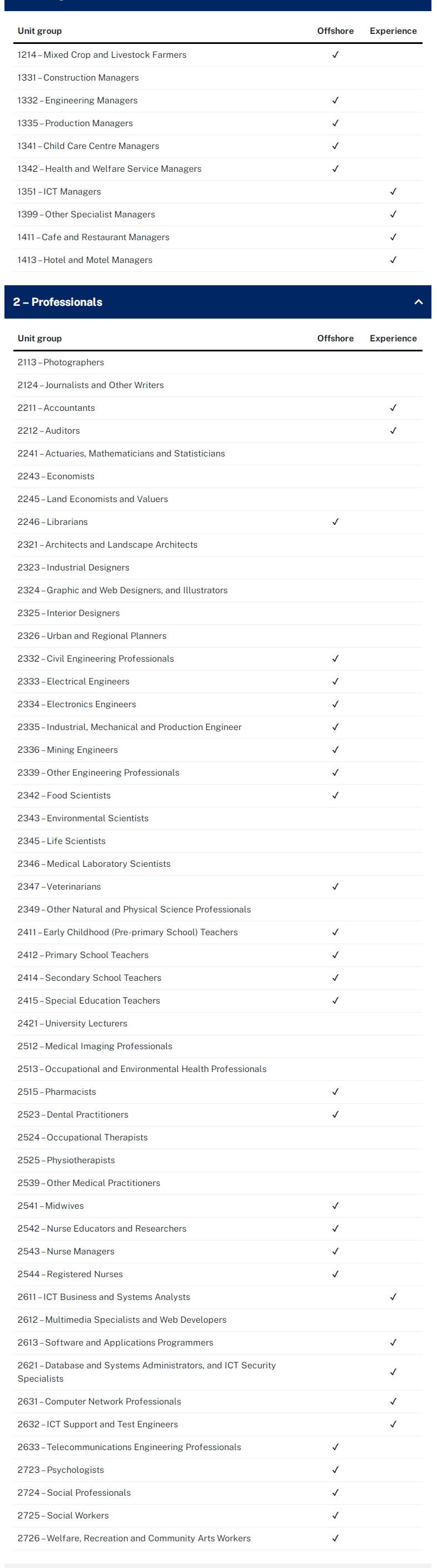 當然,最重要的是哪些職業(yè)可以境外申請,以下Offshore下打勾的就是可以境外申請,Experience下打勾的就是需要三年工作經(jīng)驗。
