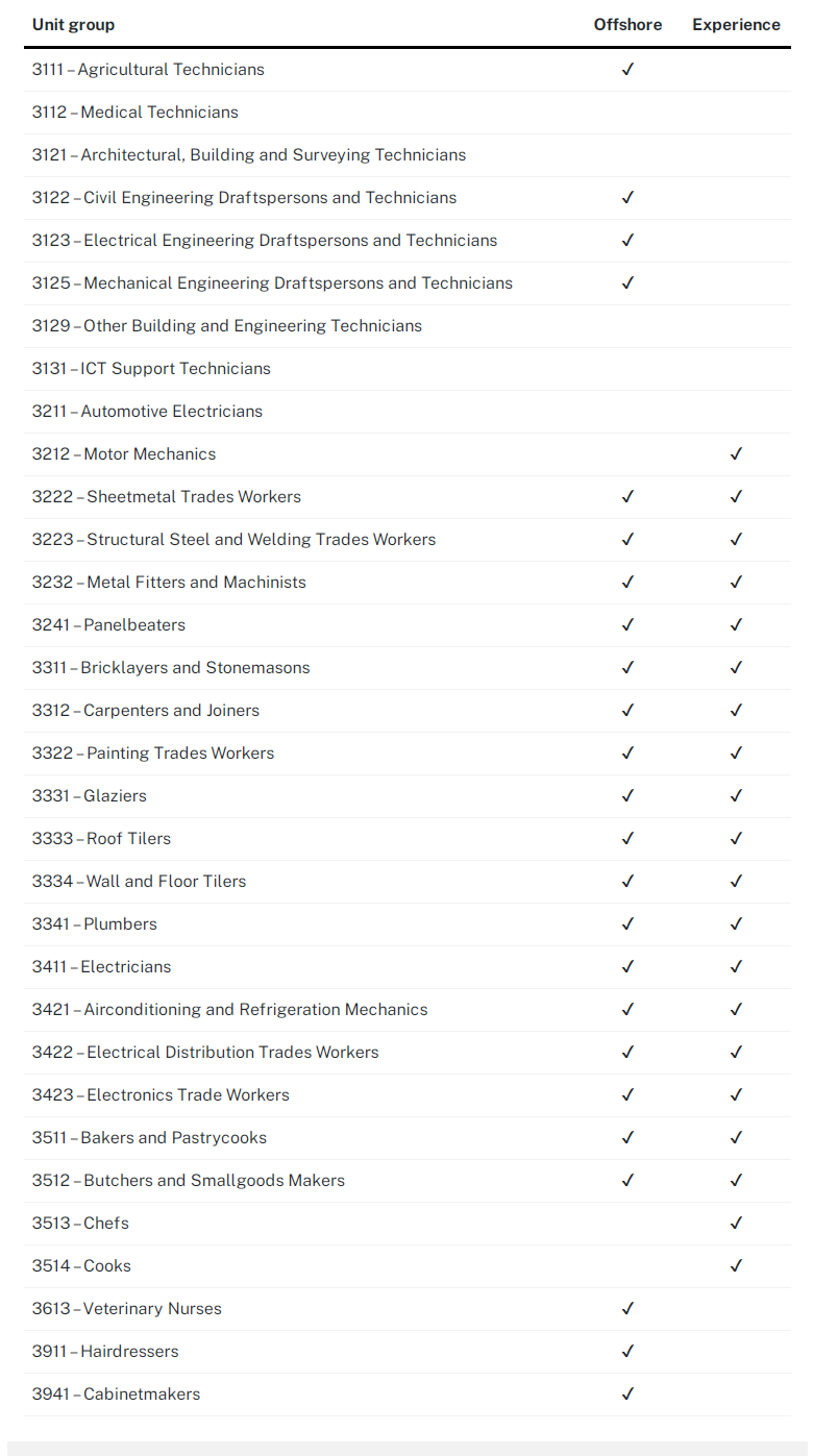 (注:不少技工類職業(yè)有雙勾,說明這些職業(yè)可在境外申請同時要求3年相關(guān)工作經(jīng)驗)