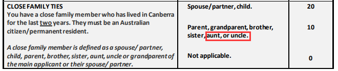 如今父母的親兄弟姐妹也包含在內(nèi),意味著只要申請者父母的親兄弟姐妹是澳洲公民或PR身份并且在堪培拉居住了至少2年,申請者就可加10分,對于申請人來說真是個好消息!