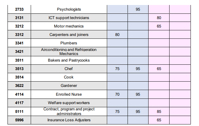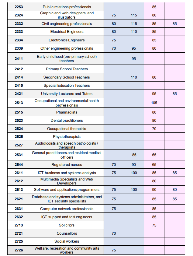 在獲邀分?jǐn)?shù)方面,我們可以看到境外190邀請(qǐng)較少,需要80分以上才能獲邀,但是境外申請(qǐng)491邀請(qǐng)到的職業(yè)非常多,幾乎70%~80%的職業(yè)都有被邀請(qǐng)到,很多都是以往在境內(nèi)申請(qǐng)獲邀職業(yè)里從未被邀請(qǐng)的職業(yè),例如廣告/PR/銷售經(jīng)理、GP、餐飲/服務(wù)/零售業(yè)經(jīng)理、汽車修理師、中學(xué)教師、建筑業(yè)經(jīng)理等等,并且境外491的邀請(qǐng)分低至65分即可,主要集中在80~90分,最低65分可獲邀的職業(yè)包括廚師、保險(xiǎn)理賠員、汽車修理師、注冊(cè)護(hù)士、GP等,其中廚師和注冊(cè)護(hù)士的境內(nèi)491獲邀分?jǐn)?shù)本輪需要70~75分,境外申請(qǐng)妥妥地占優(yōu)勢!境內(nèi)190最低分85分起步,僅GP只需85分,工程類職業(yè)需要110~115分!會(huì)計(jì)110分,少量IT職業(yè)獲邀,需要100分,其他大部分為90~95分。境內(nèi)491原先最低65分基本就能穩(wěn)獲邀,本輪都漲至70~75分了,境內(nèi)491的會(huì)計(jì)需要100分,工程類職業(yè)70~80分不等,IT類職業(yè)75分。