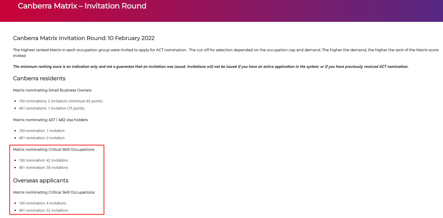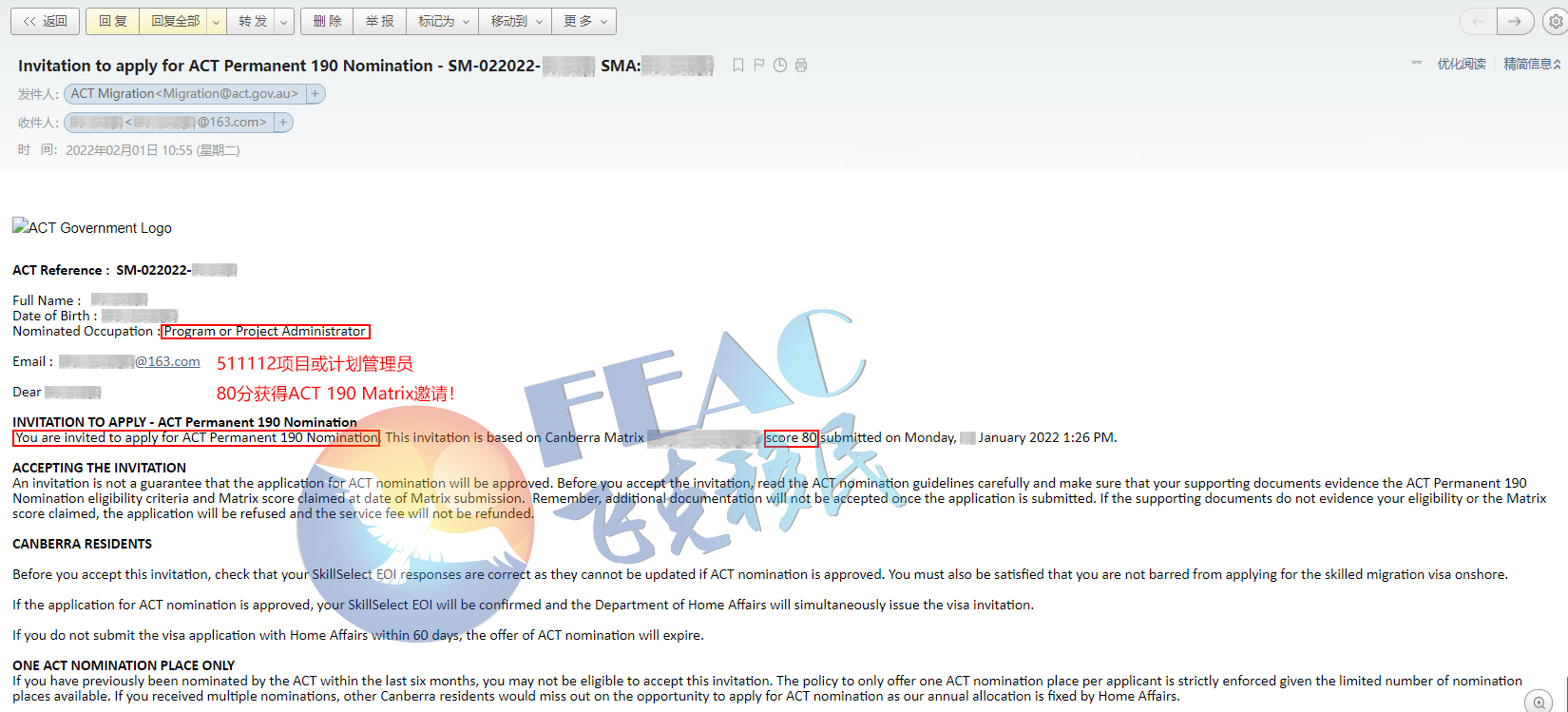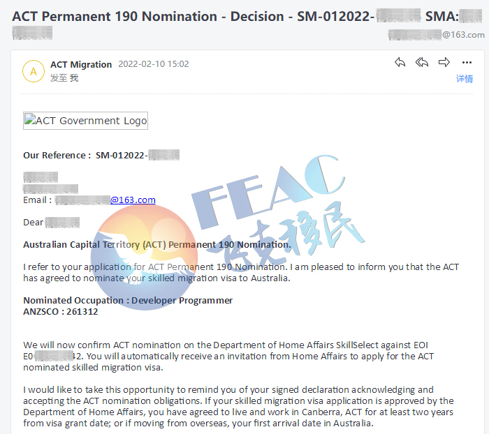 2022年2月10日獲得ACT 190擔保并EOI獲邀。
