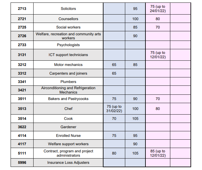 本輪獲邀的職業也非常多,并且邀請分數也比上輪降低了不少,回到正常范圍。熱門職業會計/審計、IT類、工程類、廚師、幼教/中教、社工、餐廳/咖啡店經理等都有邀請,境內491最低65分,大部分在70~85分可獲邀,190最低分85分獲邀,例如廣告/市場/公關專員,社工和ICT支持和測試工程師。境外190 的邀請分數在75~85分,1399專家經理75分,ICT manager80分,餐廳酒店經理和土木工程85分,境外491也是最低65分獲邀,包括注冊護士,已經審理至2022年1月18日遞交的申請,還有眾多70~85分獲邀的,大部分熱門職業的分數都在這個區間內,例如餐廳經理70分,客服經理/中學教師75分,HR經理/平面和網頁設計師/多媒體專家/廚師80分,會計/財務經理/土木/電氣/電子工程85分。