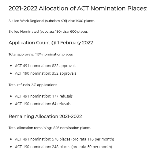 截至2022年2月1日,本財年堪培拉491州擔提名已通過822個,拒絕177個,190州擔提名已通過352個,拒絕64個。配額逐漸減少,目前190剩余248個(預計平均每月50個),491剩余578個(預計平均每月116個)。