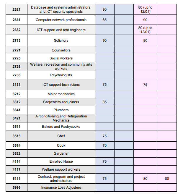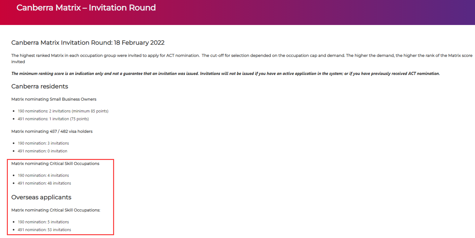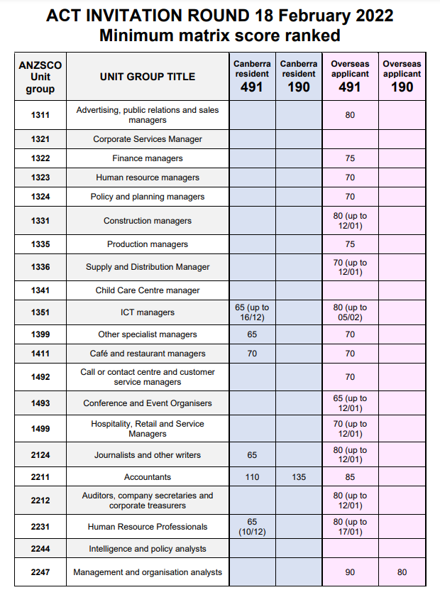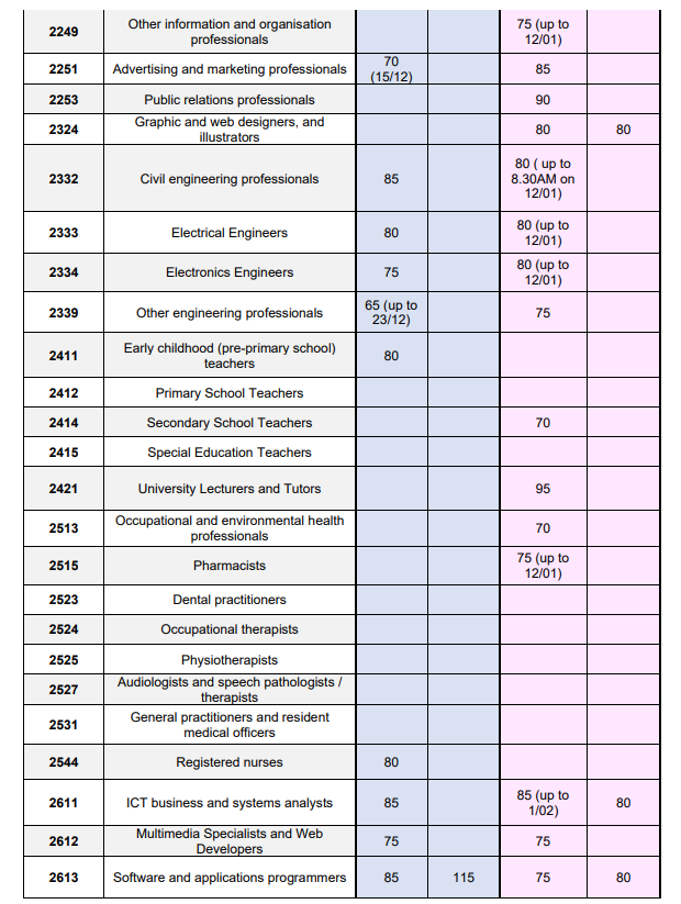 而境外190本輪邀請了5個,最低分數均是80分,有2247管理和組織分析師、2324平面和網頁設計、2611ICT業務分析師、2613軟件工程和5111 合同、計劃和項目管理員。境外491最低65分,大部分在70-80分!包括1493會議和活動組織者65分,HR經理、政策和規劃經理、客服經理、酒店和零售服務經理、中學教師70分,財務經理、其他工程、藥劑師、多媒體專家和軟件工程75分,廣告/公關經理、工程經理、ICT經理、審計、土木/電子/電氣工程、數據庫和系統管理員等80分。