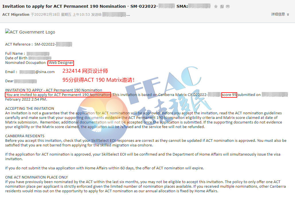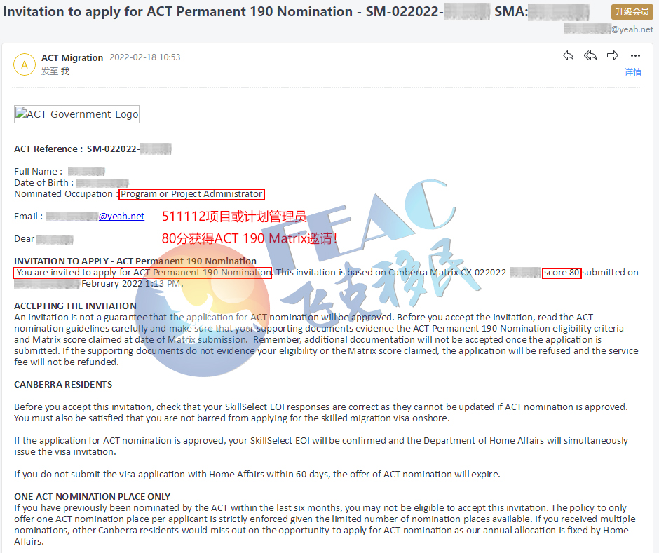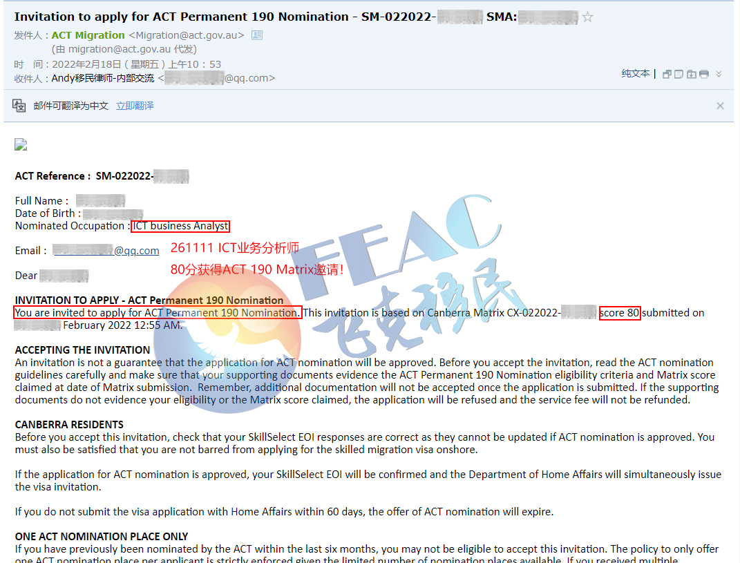 2022年2月17日遞交ACT Matrix打分(80分),2022年2月18日獲得ACT 190 Matrix邀請。