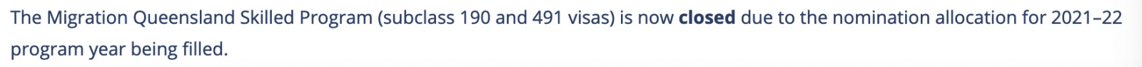 昆士蘭州于上周五宣布,由于配額已滿,本2021-22財年的Skilled Program技術移民通道(190和491類別)現已關閉。