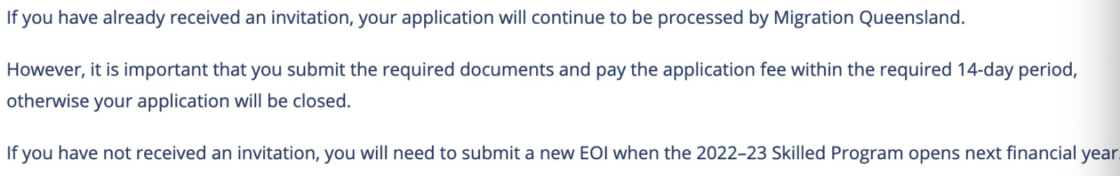 如果您已經收到預邀請,您的申請將繼續由昆士蘭移民處處理。但是必須要在獲得預邀請后的14天內提交官方要求的材料以及完成付費,否則您的申請將被關閉。