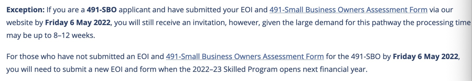 如果您是491-SBO小生意類別的申請人,且在2022年5月6日之前通過官網遞交了EOI和491-小企業業主評估表(491- Small Business Owners Assessment Form),您仍然有機會收到邀請。但是由于申請人數過多,官方處理時間會有所延長,您的等待時間會延長至8到12周。