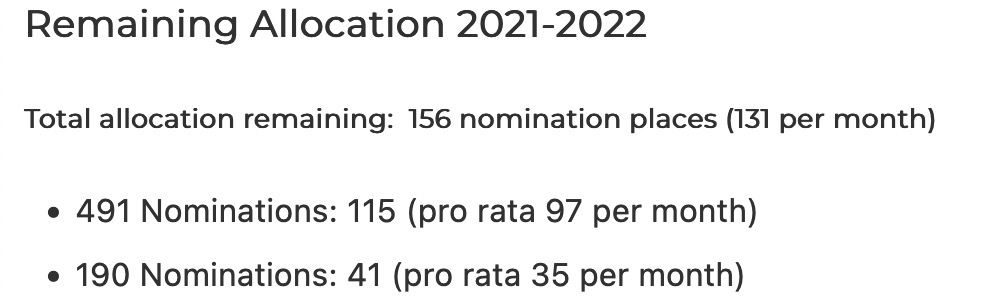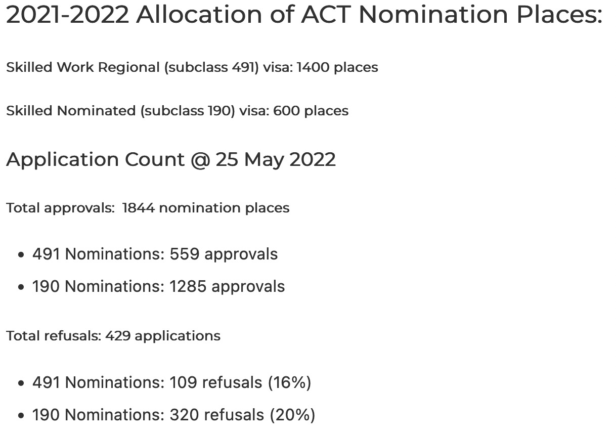 根據官網更新顯示,截至2022年5月25日,堪培拉491州擔提名已通過559個,拒絕109個,拒絕率為16%;190州擔當提名已通過1285個,拒絕320個,拒絕率為20%。491和190共計通過1844個,共計拒絕429個。