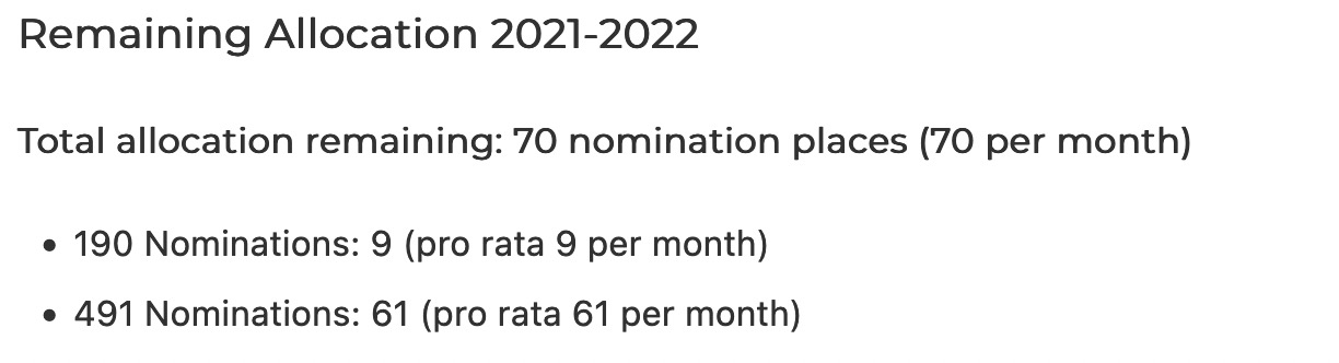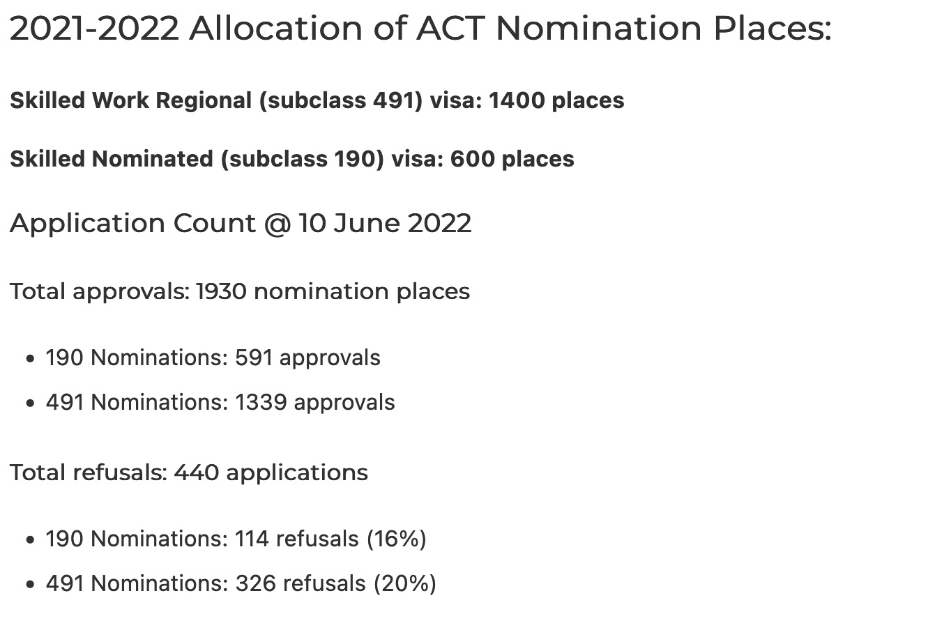 根據官網更新顯示,截至2022年6月10日,堪培拉491州擔提名已通過591個,拒絕114個,拒絕率為16%;190州擔當提名已通過1339個,拒絕326個,拒絕率為20%。491和190共計通過1930個,共計拒絕440個。