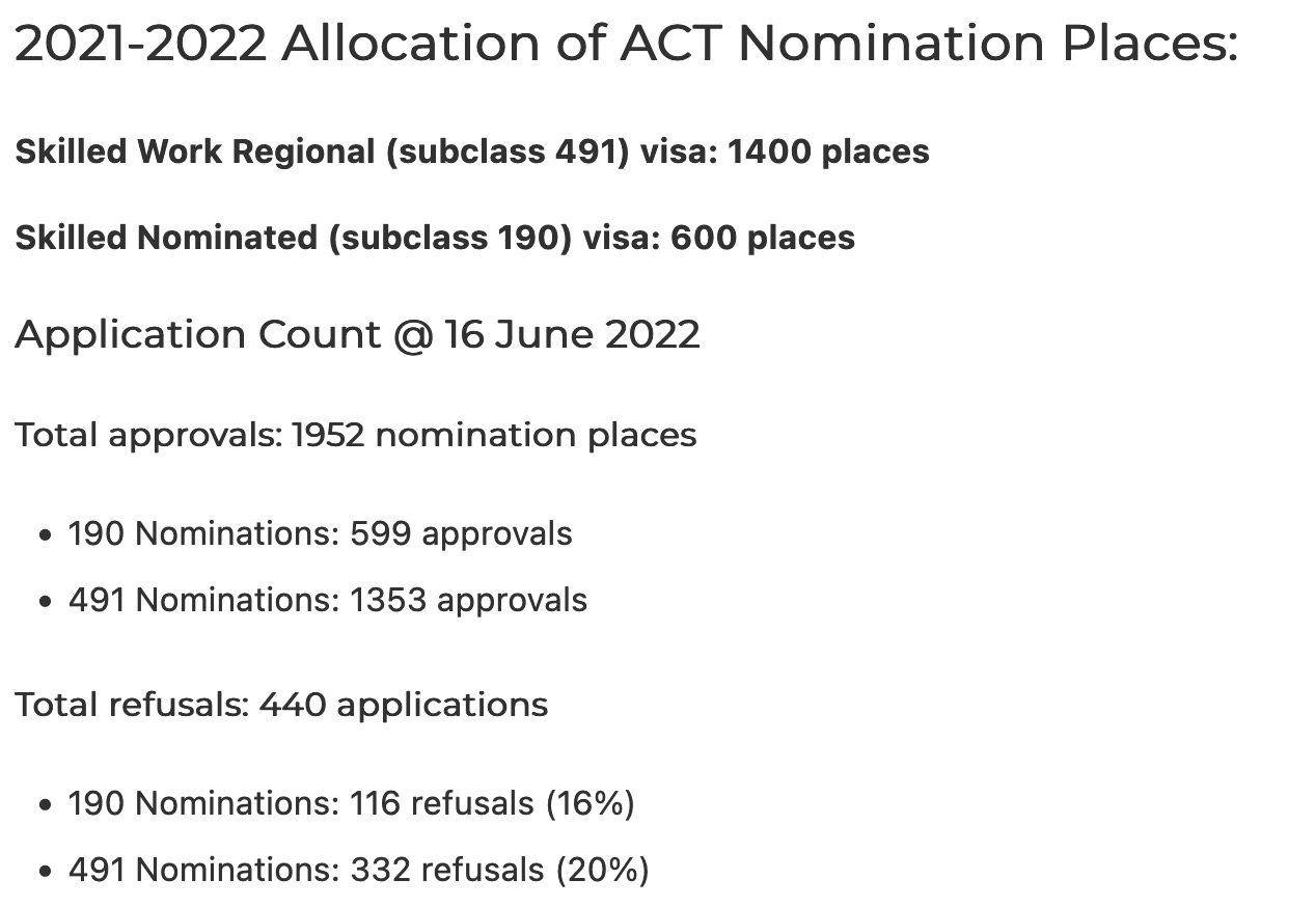 根據(jù)官網(wǎng)更新顯示,截至2022年6月16日,堪培拉491州擔(dān)提名已通過599個(gè),拒絕116個(gè),拒絕率為16%;190州擔(dān)當(dāng)提名已通過1353個(gè),拒絕332個(gè),拒絕率為20%。491和190共計(jì)通過1952個(gè),共計(jì)拒絕448個(gè)。