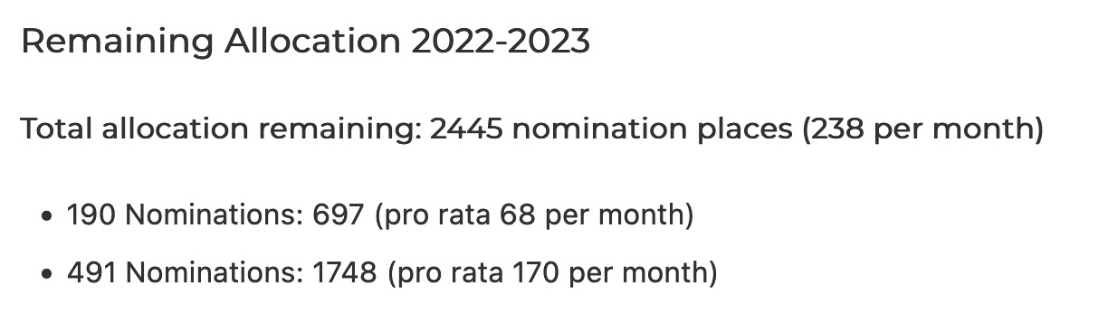 本財年共剩余2445個配額,其中190剩余697個,491剩余1748個。