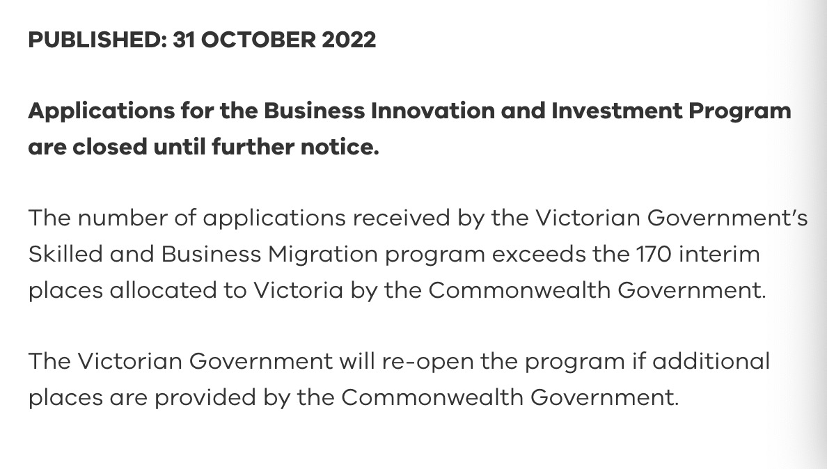 維州官網今天更新:商業創新與投資計劃(Business Innovation and Investment Program)的申請已關閉,等待進一步通知。
