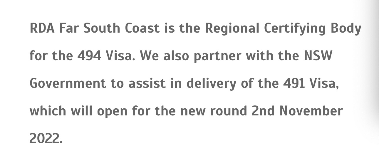 RDA Far South Coast地區是494簽證的區域認證機構。且還將與新州政府合作,協助提供491簽證,該簽證將在2022年11月2日(即本周三)開放新一輪申請。