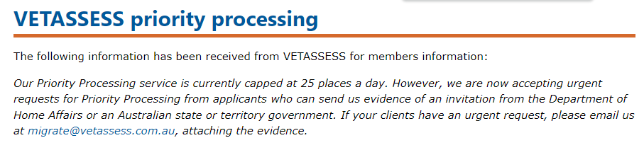 VETASSESS表示,目前優先處理服務的上限為每日25個名額,現在可接受申請人的緊急申請。如果申請人職業評估即將或已過期,且已收到移民局或州政府的邀請,可申請加急服務以獲得優先處理。