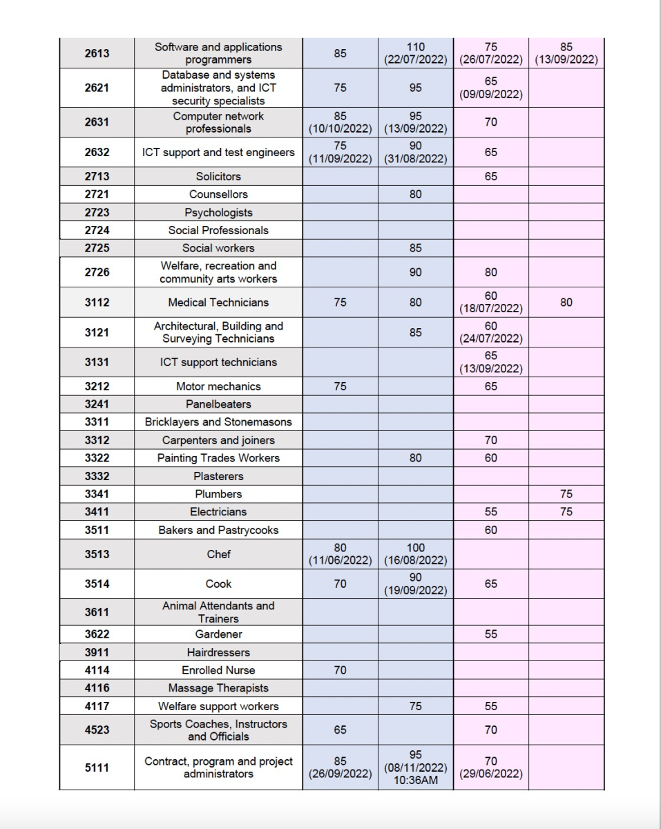 --最低獲邀分75分的專業有4117福利支持人員、3341水管工、3411電工、2524物理治療師,1331建筑經理,以及2414中學教師和2415特殊教育教師。