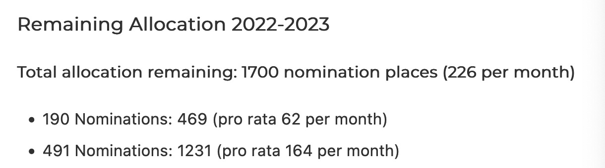 ACT本財年的臨時配額為:190配額共800個,491配額為1920個。除去11月14日最新一輪Matrix邀請,190剩余469個配額,491剩余1231個配額,共計1700個。