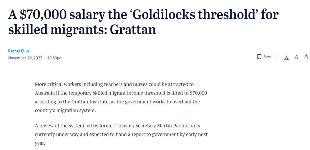 根據(jù)格拉坦研究所(Grattan Institute)的數(shù)據(jù)顯示,如果澳大利亞將臨時(shí)技術(shù)移民的收入門檻提高至7萬(wàn)澳元,會(huì)吸引包括教師和護(hù)士在內(nèi)的更多人才前往澳大利亞。由前財(cái)政部長(zhǎng)馬丁·帕金森(Martin Parkinson)領(lǐng)導(dǎo)的對(duì)該體系的評(píng)估目前正在進(jìn)行中,預(yù)計(jì)將在明年初向政府提交一份報(bào)告。