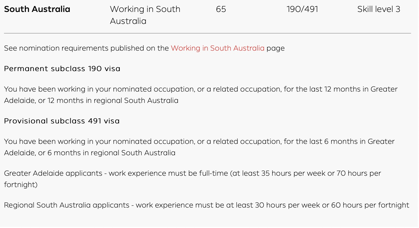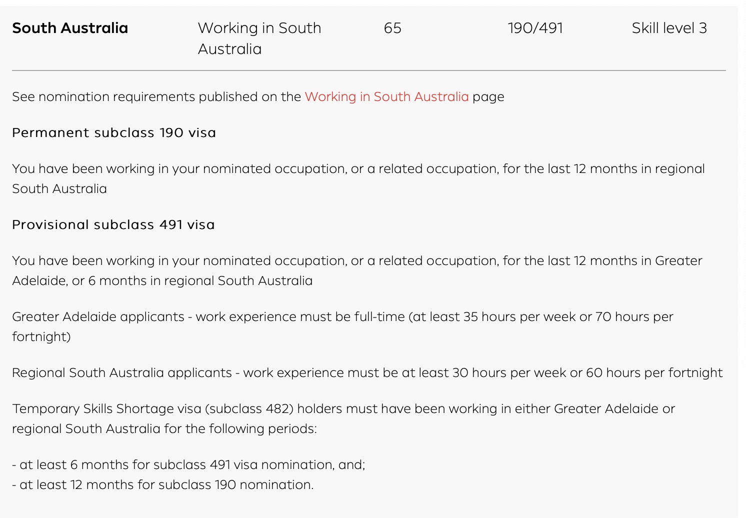 -申請人過去的12個月內在阿德萊德地區從事提名職業或相關職業/申請人在過去6個月內在南澳偏遠地區從事提名職業或相關職業