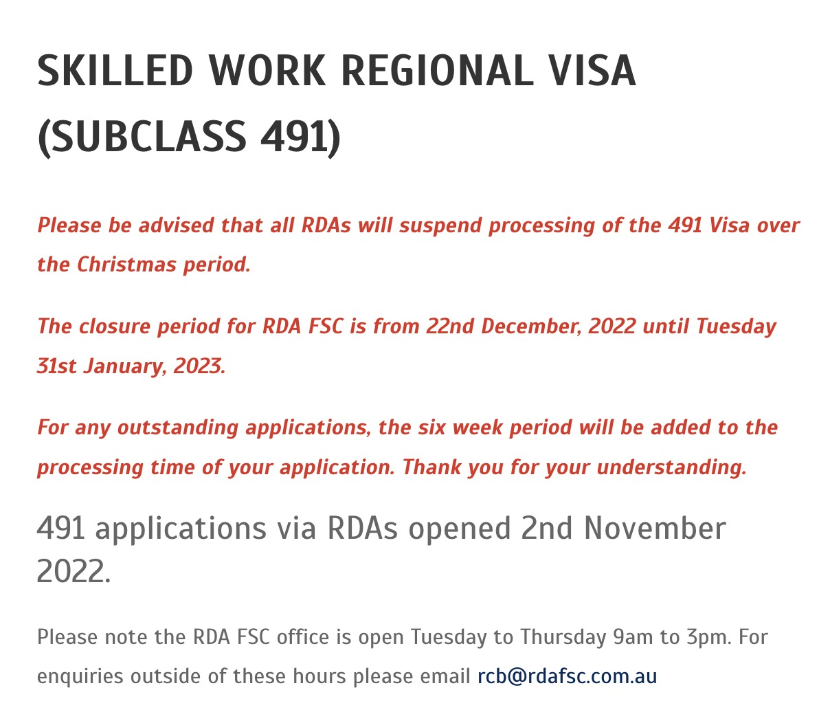 所有RDA地區將在2022年12月22日到2023年1月31日星期二圣誕節期間暫停處理491簽證。