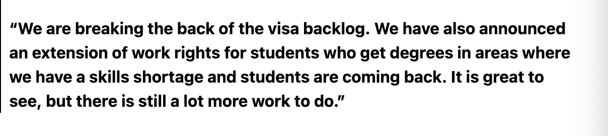 并表示,“我們正在打破目前簽證積壓的局面。并將延長在技能短缺領(lǐng)域獲得學(xué)位的學(xué)生的工作權(quán)利。”