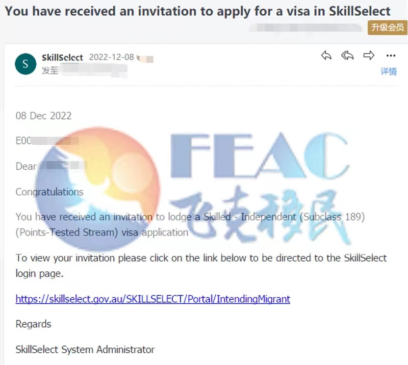 客戶獲邀分數65, 2022.10.14遞交EOI,2022.12.8獲邀。