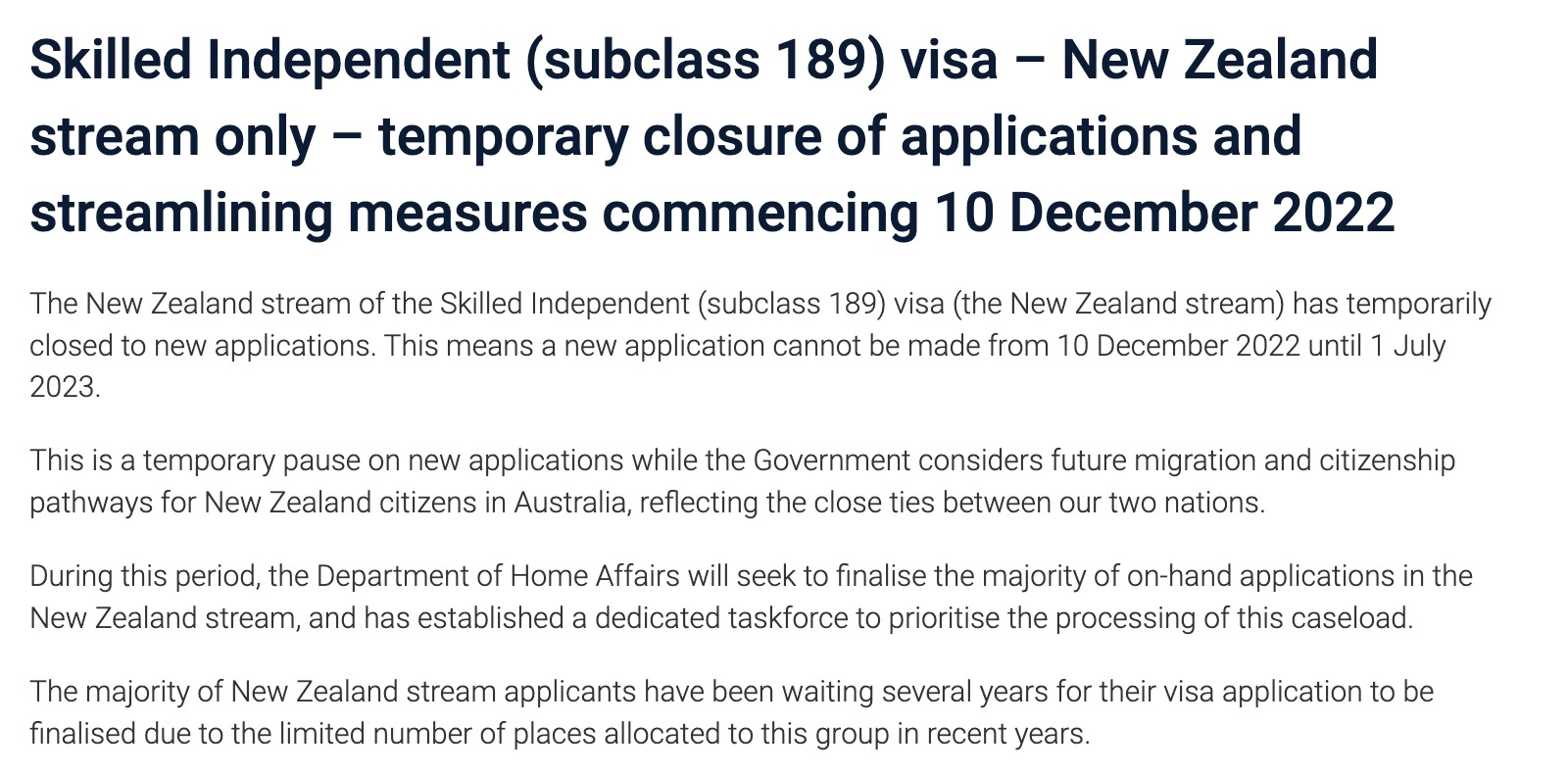 根據移民局上周日的更新,189簽證-新西蘭分支將暫停接受新的申請,時間從2022年12月10日到2023年7月1日。在此期間,移民局將設置專門的工作組來優先處理現在手頭上的申請積壓。