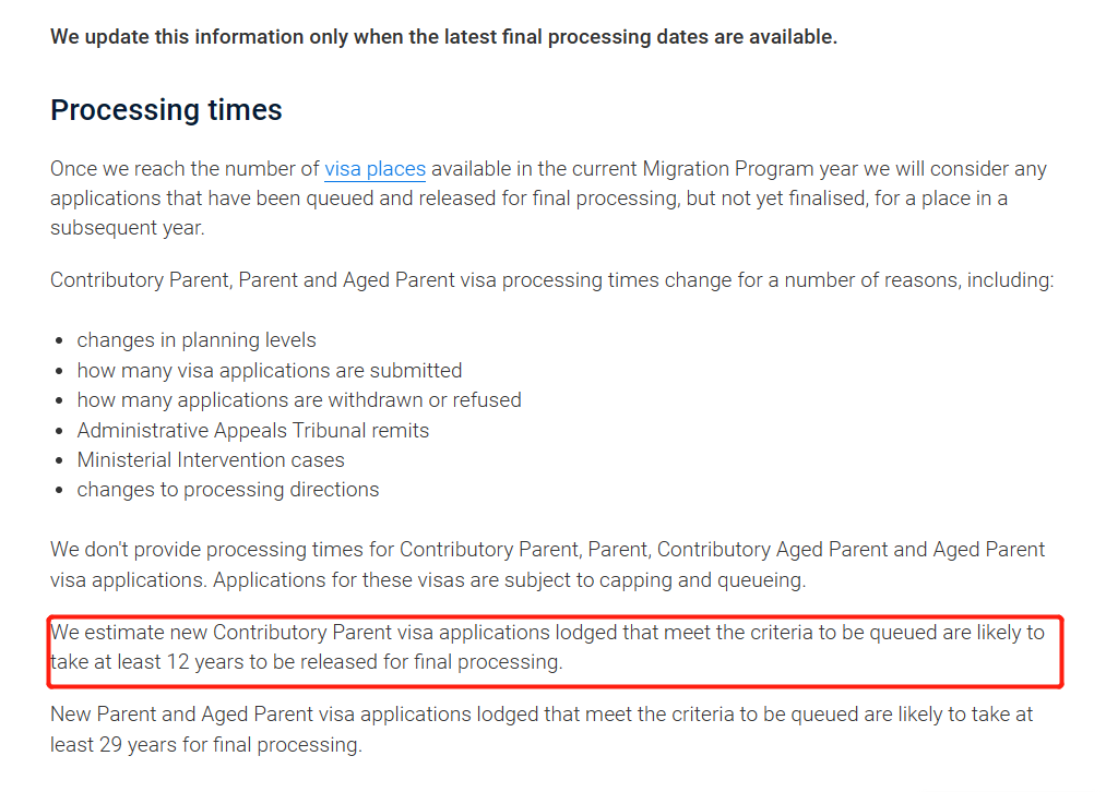 近期,澳洲移民局付費父母移民(143/864)排隊等待時間更新為12年,見下圖。(原先是6年)